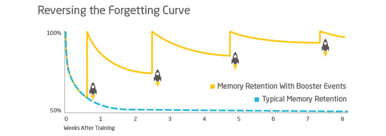 Coined by psychologist Hermann Ebbinghaus, the forgetting curve details the rate at which we as humans forget. Within just one week of training, employees can forget up to 80% of what they’ve learned, greatly reducing the effectiveness of your training programs. Increasing knowledge retention starts with booster events, and short refreshers on the most important parts of training that help cement learning before it’s forgotten.